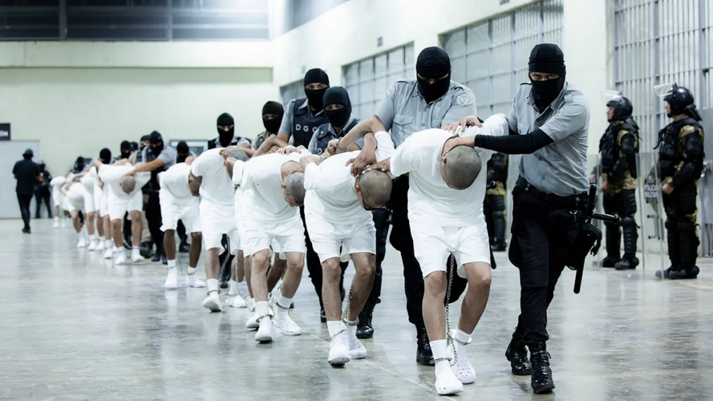 - El Salvador presidential press office. Photo of prison guards transferring deportees from the U.S. to the Terrorism Confinement Center. AP; 2024.