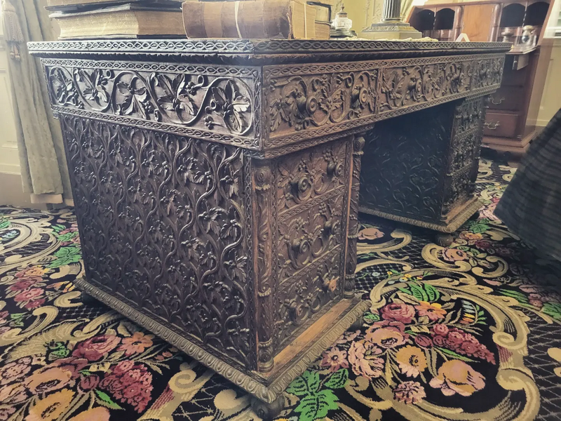 Buchanan’s teak desk is a masterpiece of global craftsmanship and presidential legacy, carved from rich Indian teakwood and steeped in history.