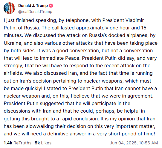 - Trump D. Truth Social post on phone call with Putin. Truth Social. 2023.