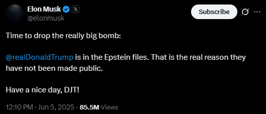 “Time to drop the really big bomb: @realDonaldTrump is in the Epstein files… Have a nice day, DJT!”