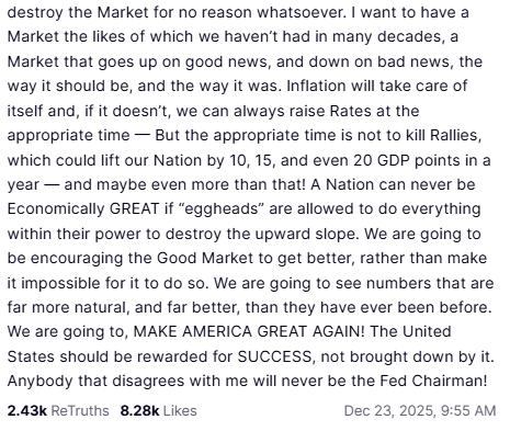 The post claims GDP growth hit 4.2% against predictions of 2.5%. It argues that markets now go down on good news because investors expect rate hikes to combat inflation. And it concludes with a threat: “Anybody that disagrees with me will never be the Fed Chairman!”