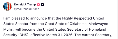 The lack of preparation suggests Trump’s decision was rapid—possibly made Thursday morning after learning about Noem’s congressional testimony Wednesday. Mullin wasn’t vetted in advance, wasn’t consulted about interest in the position, and learned of nomination via surprise phone call.