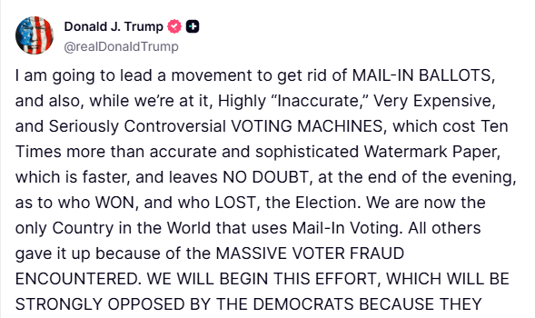 I am going to lead a movement to get rid of MAIL-IN BALLOTS, and also, while we’re at it, Highly “Inaccurate,” Very Expensive, and Seriously Controversial VOTING MACHINES, which cost Ten Times more than accurate and sophisticated Watermark Paper, which is faster, and leaves NO DOUBT, at the end of the evening, as to who WON, and who LOST, the Election. We are now the only Country in the World that uses Mail-In Voting. All others gave it up because of the MASSIVE VOTER FRAUD ENCOUNTERED. WE WILL BEGIN THIS EFFORT, WHICH WILL BE STRONGLY OPPOSED BY THE DEMOCRATS BECAUSE THEY CHEAT AT LEVELS NEVER SEEN BEFORE, by signing an EXECUTIVE ORDER to help bring HONESTY to the 2026 Midterm Elections. Remember, the States are merely an “agent” for the Federal Government in counting and tabulating the votes. They must do what the Federal Government, as represented by the President of the United States, tells them, FOR THE GOOD OF OUR COUNTRY, to do. With their HORRIBLE Radical Left policies, like Open Borders, Men Playing in Women’s Sports, Transgender and “WOKE” for everyone, and so much more, Democrats are virtually Unelectable without using this completely disproven Mail-In SCAM. ELECTIONS CAN NEVER BE HONEST WITH MAIL IN BALLOTS/VOTING, and everybody, IN PARTICULAR THE DEMOCRATS, KNOWS THIS. I, AND THE REPUBLICAN PARTY, WILL FIGHT LIKE HELL TO BRING HONESTY AND INTEGRITY BACK TO OUR ELECTIONS. THE MAIL-IN BALLOT HOAX, USING VOTING MACHINES THAT ARE A COMPLETE AND TOTAL DISASTER, MUST END, NOW!!! REMEMBER, WITHOUT FAIR AND HONEST ELECTIONS, AND STRONG AND POWERFUL BORDERS, YOU DON’T HAVE EVEN A SEMBLANCE OF A COUNTRY. THANK YOU FOR YOUR ATTENTION TO THIS MATTER!!! DONALD J. TRUMP, PRESIDENT OF THE UNITED STATES OF AMERICA