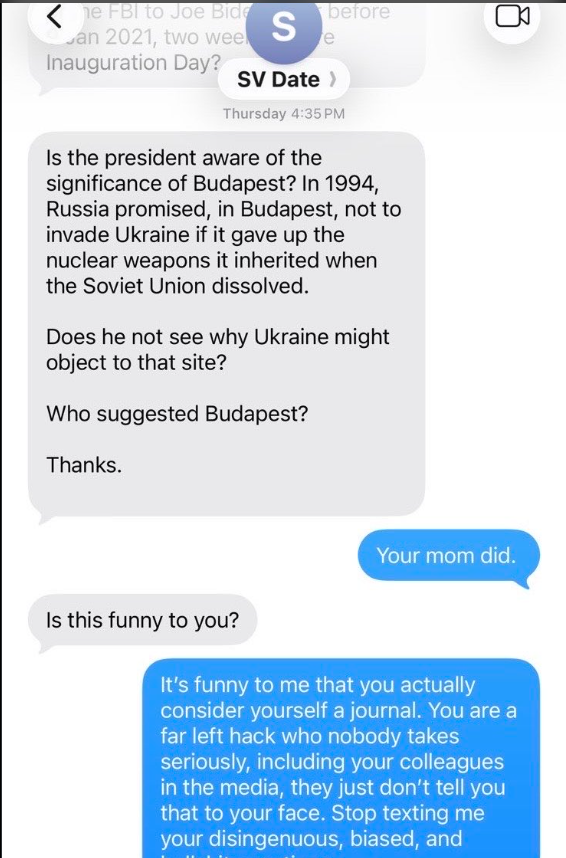 Dáte: “Is the president aware of the significance of Budapest?… Does he not see why Ukraine might object to that site? Who suggested Budapest?” Leavitt: “Your mom did.”